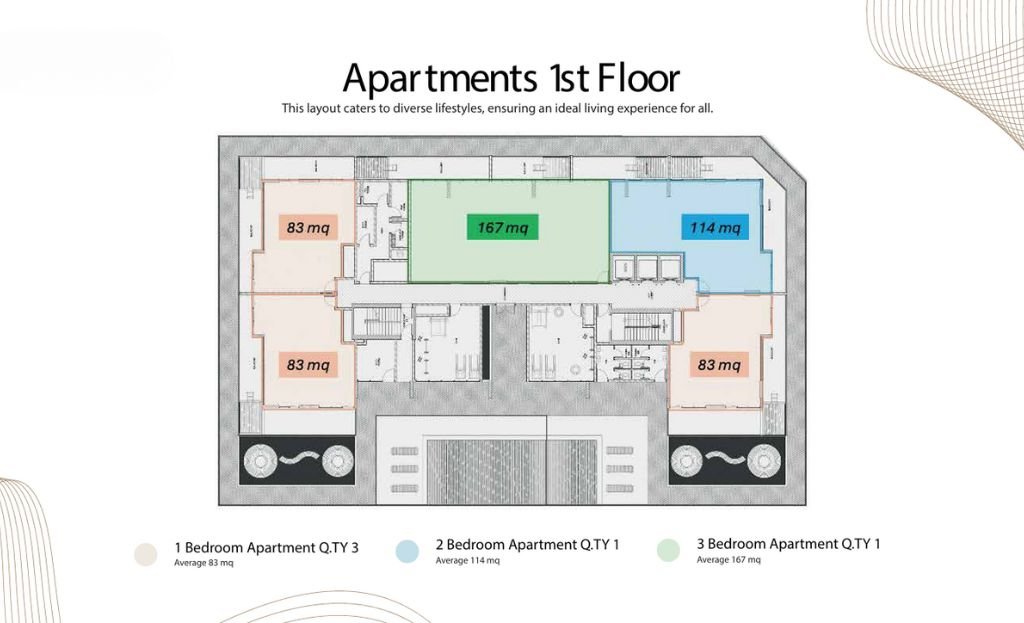 - Unit Types & Sizes: 1, 2 and 3-bedroom apartments, plus exclusive 3-bedroom duplex penthouse units. Apartment sizes range roughly from ~891 sq ft for a one-bedroom up to ~1,703 sq ft for a three-bedroom, while duplex penthouses span ~2,655–2,791 sq ft. Every unit comes fully furnished with premium Natuzzi interiors and high-quality appliances.